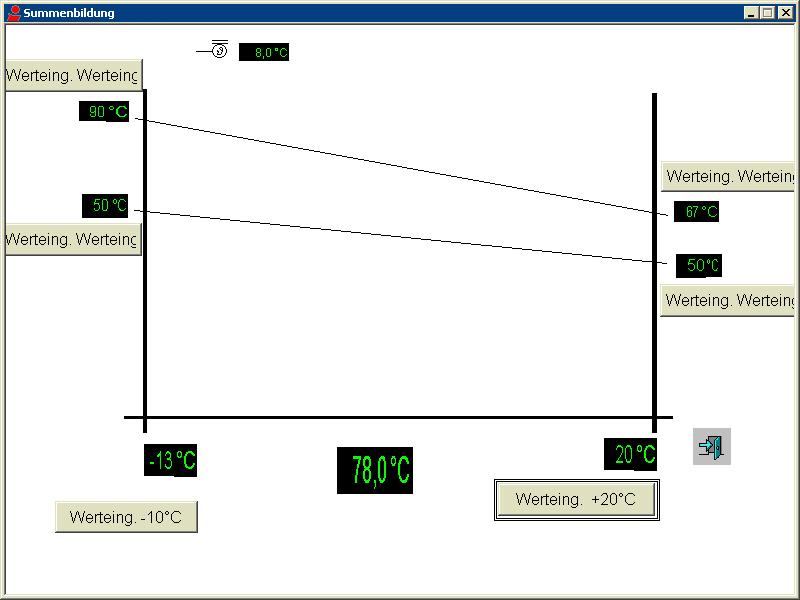 Das graphische Bild entspricht dem Hydraulikschema mit hinterlegten Daten für Temperaturen und momentanem Statuszustand der einzelnen aufgeführten Ventile, Pumpen, etc. Die separaten Bilder für die verschiedenen Kessel können wahlweise durch Anklicken mit der PC-Maus auf das entsprechende Kesselsymbol aufgerufen werden, d.h. das System hat mehrere Unterbilder. Somit haben wir für den Benutzer keinen Datenüberfluss auf dem Hauptbild und die Daten können speziell für den Benutzer aus jedem Bild herausgesucht werden. |